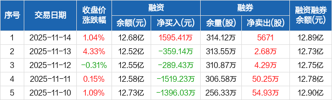 融资方面,当日融资买入1.24亿元,融资偿还1.08亿元,融资净买入1595.41万元。融券方面,融券卖出8851股,融券偿还3180股,融券余量314.12万股,融券余额2139.16万元。融资融券余额合计12.89亿元。