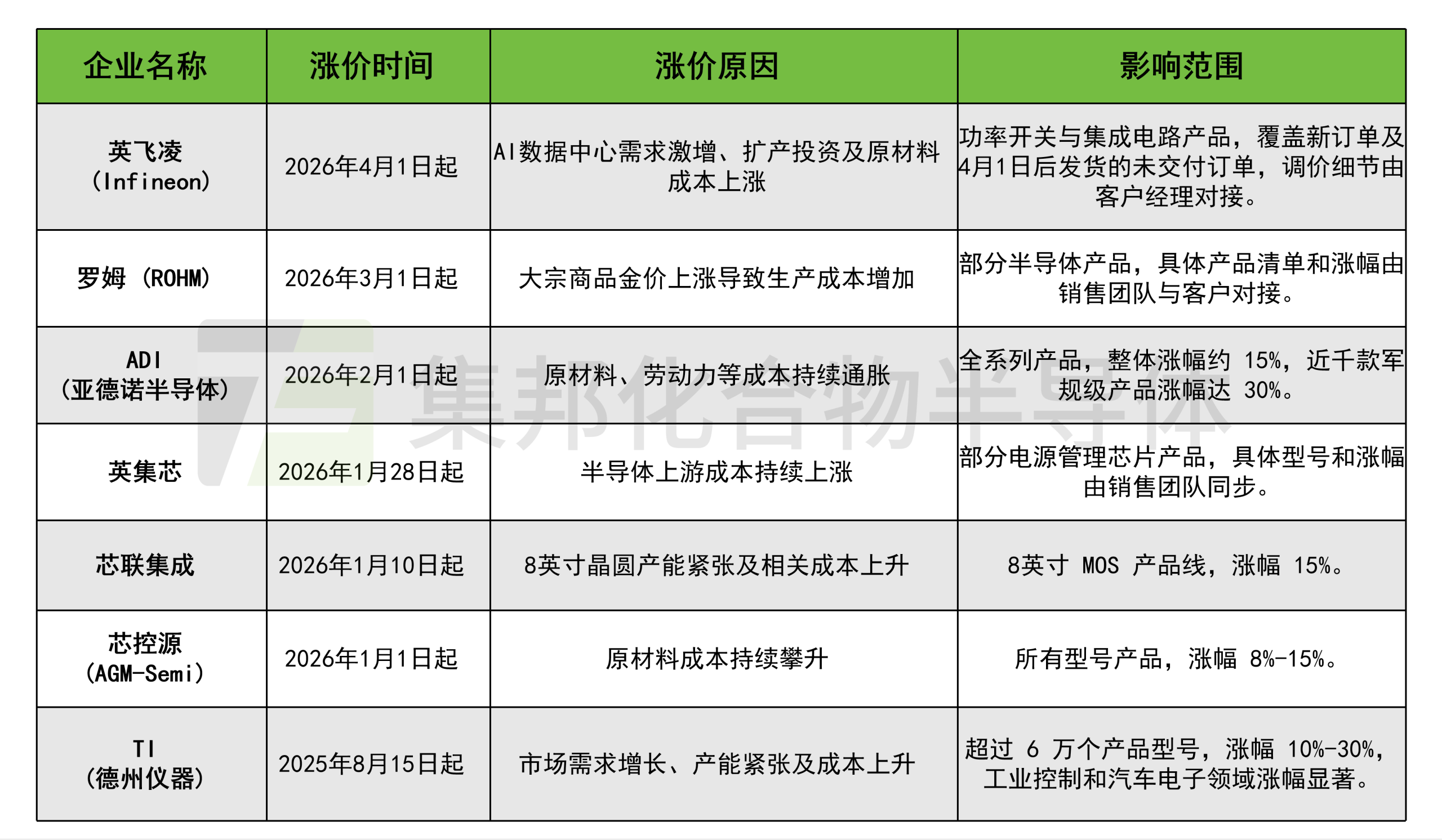 英飞凌的涨价动作,成为全球功率半导体涨价潮的重要信号。截至目前,国内外已有多家功率半导体企业明确发布涨价通知或官宣调价计划,涵盖国际大厂与国内本土企业。