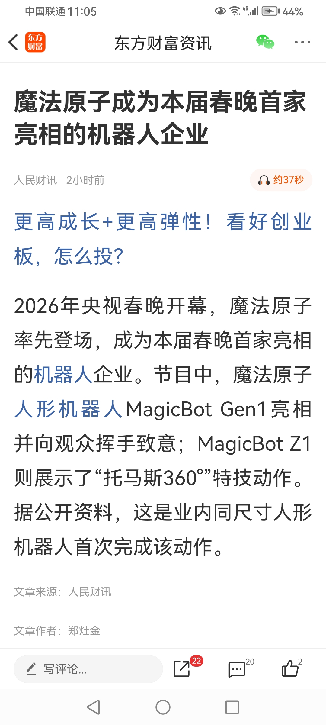 $芯联集成-U(SH688469)$ 2026年央视春晚开幕,魔法原子率先登场,成为本届春晚首家亮相的机器人企业。节目中,魔法原子人形机器人MagicBot Gen1亮相并向观众挥手致意;MagicBot Z1则展示了“托马斯360”特技动作。据公开资料,这是业内同尺寸人形机器人首次完成该动作。
