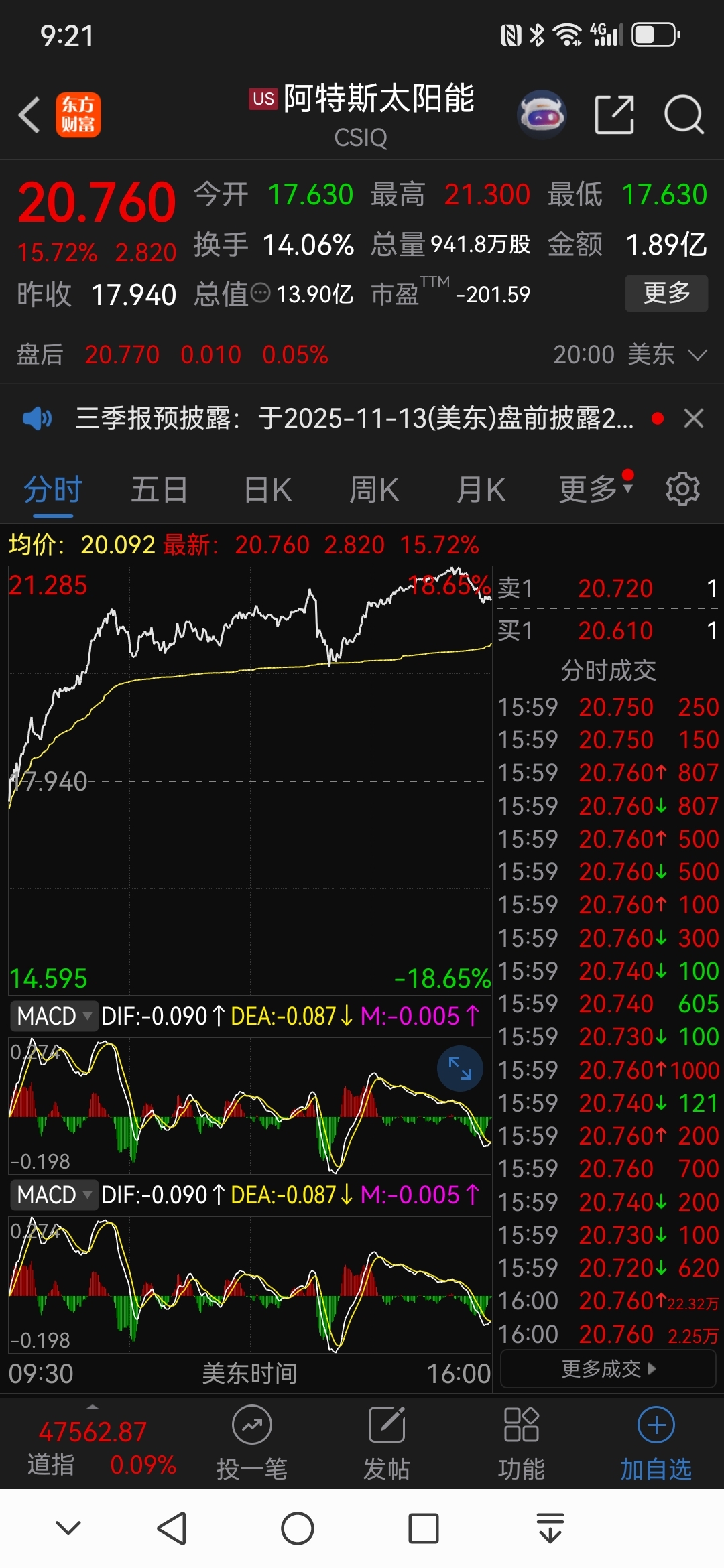 昨晚美股阿特斯太阳能大涨15.74%,周一吃肉肉