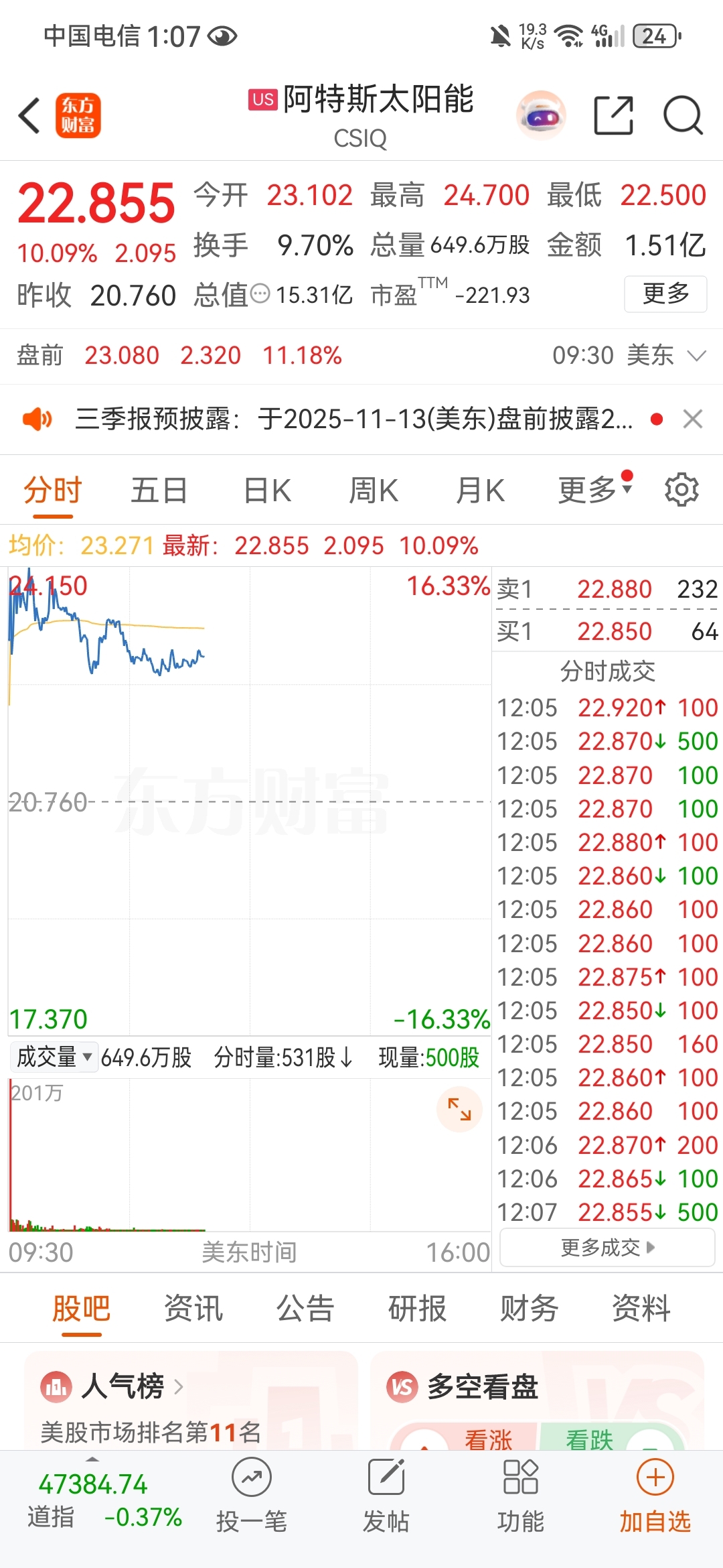 今天晚上美股的阿特斯大涨,阿特斯是A股和美股两地上市的企业,今晚阿特斯的股价大涨