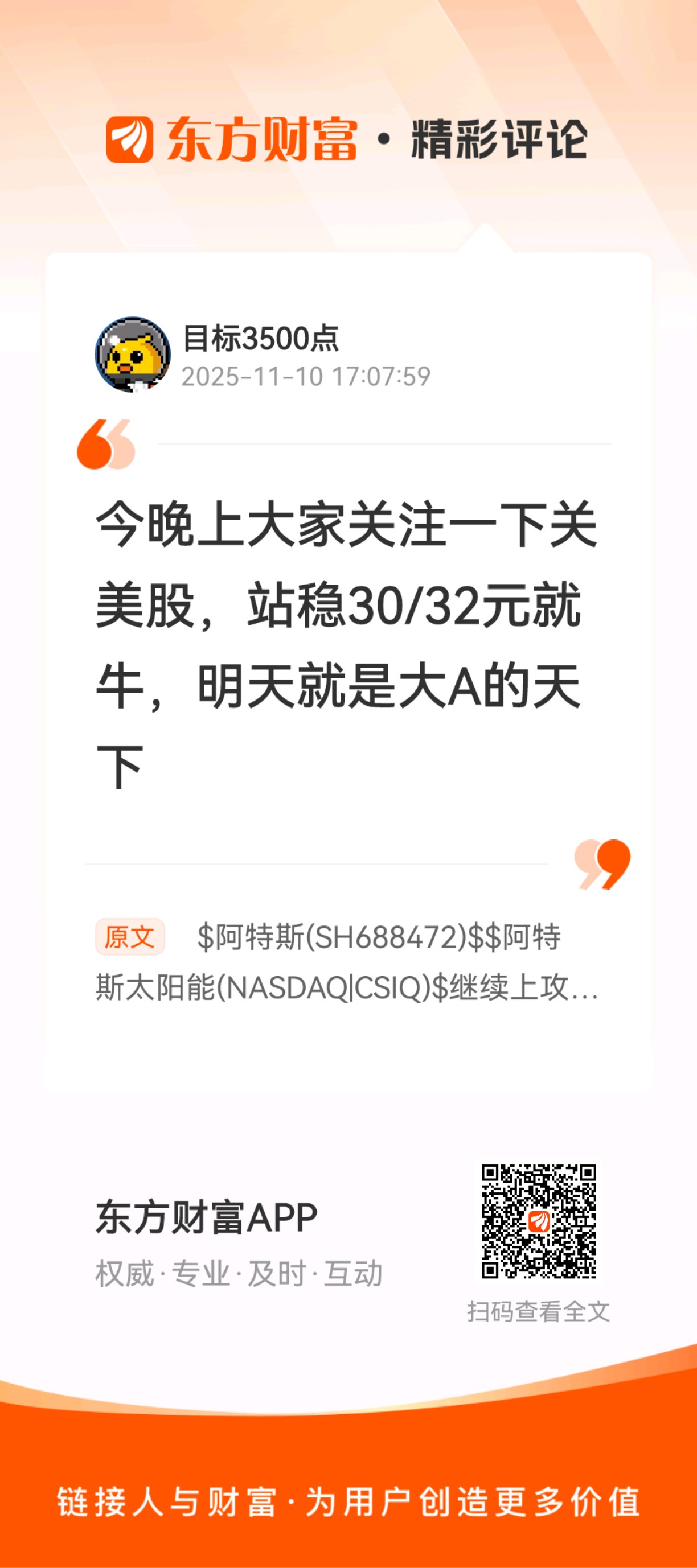 $阿特斯(SH688472)$//@目标3500点 :今晚上大家关注一下关美股,站稳30/32元就牛,明天就是大A的天下
