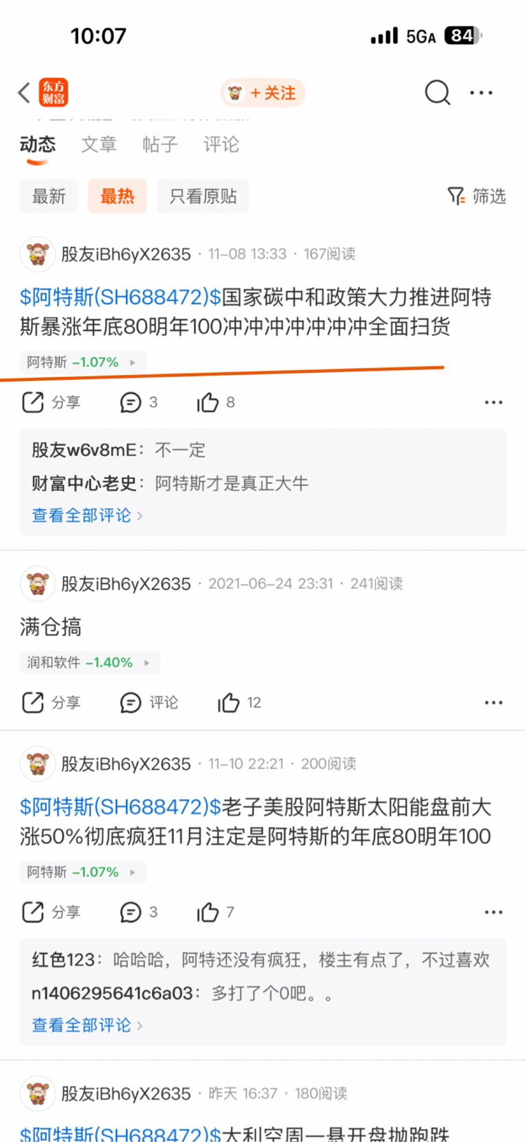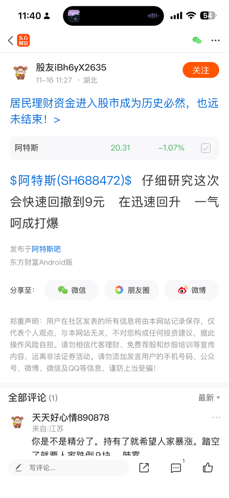 $阿特斯(SH688472)$ 这个贴吧里有个人精分了,持有了就希望这个股暴涨到100,踏空了就希望人家跌倒9块,简直肺雾,性格有问题,从小没受到教育,附件截图大家查看