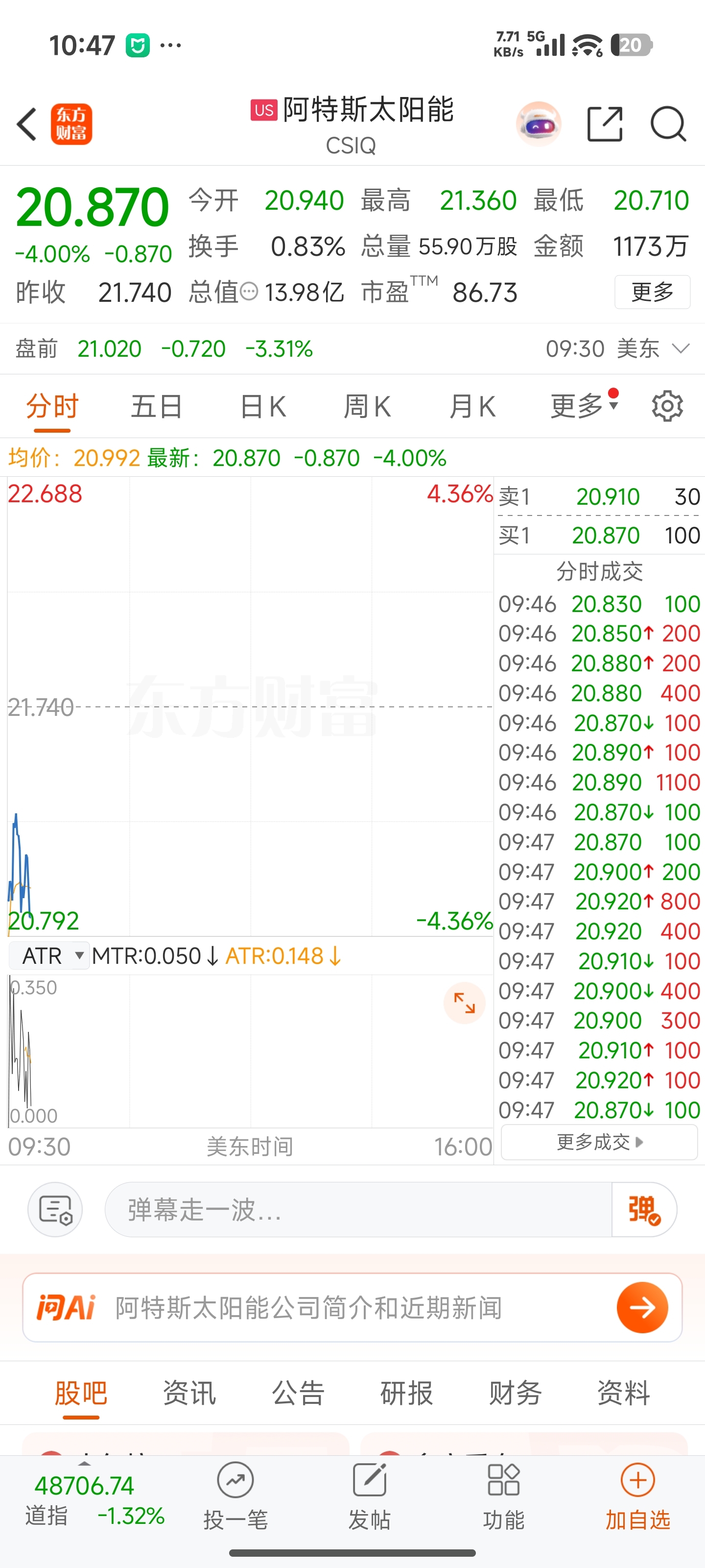 $阿特斯(SH688472)$ 完了,母公司美股阿特斯太阳能开盘大跌4个点,美股开盘也是大跌,明天又要继续吃碗大面了