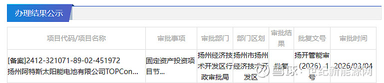 3月4日,扬州经济技术开发区行政审批局对扬州阿特斯太阳能电池有限公司TOPCon二代产品及BC产品升级改造项目进行审批结果公示。
