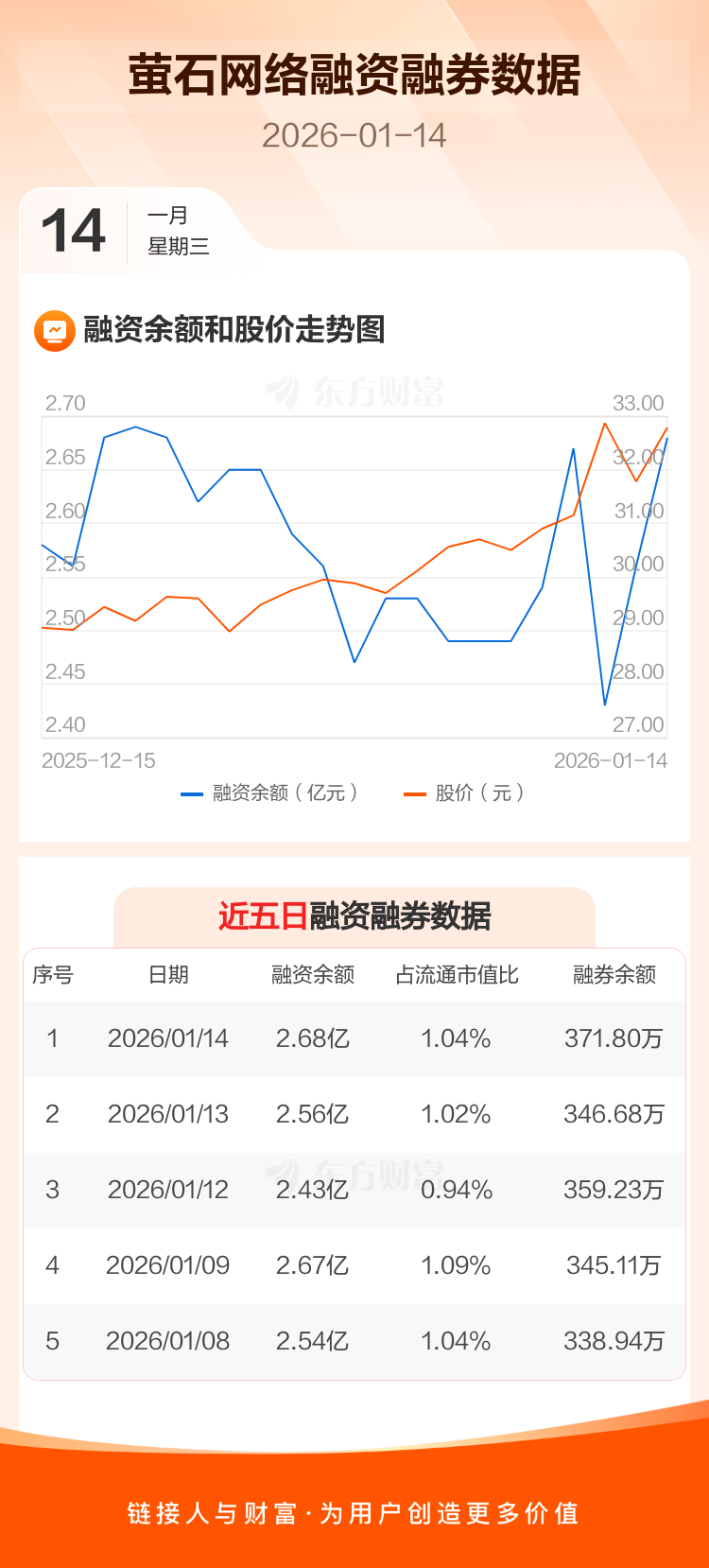 交易所最新数据显示,萤石网络于2026年1月14日获融资买入6323.22万元,融资偿还5081.98万元,当日融资净买入1241.24万元。目前,该股融资余额2.68亿,占流通市值比例为1.04%。