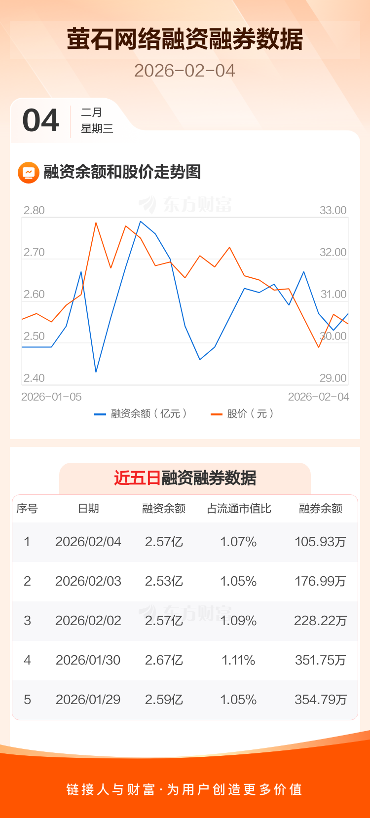 交易所最新数据显示,萤石网络于2026年2月4日获融资买入1916.26万元,融资偿还1567.93万元,当日融资净买入348.33万元。目前,该股融资余额2.57亿,占流通市值比例为1.07%。