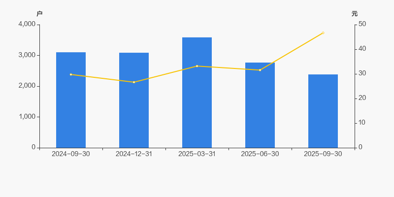 截至2025年9月30日,公司最新总股本为9532.62万股,其中流通股本为6384.62万股。户均持有流通股数量由上期的2.31万股上升至2.68万股,户均流通市值125.04万元。