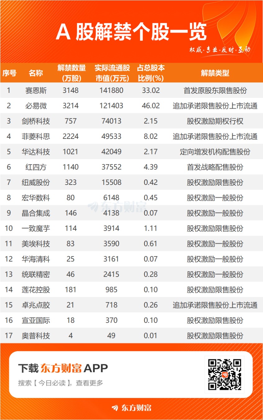【明日解禁】明日17股解禁 赛恩斯、必易微解禁市值居前
