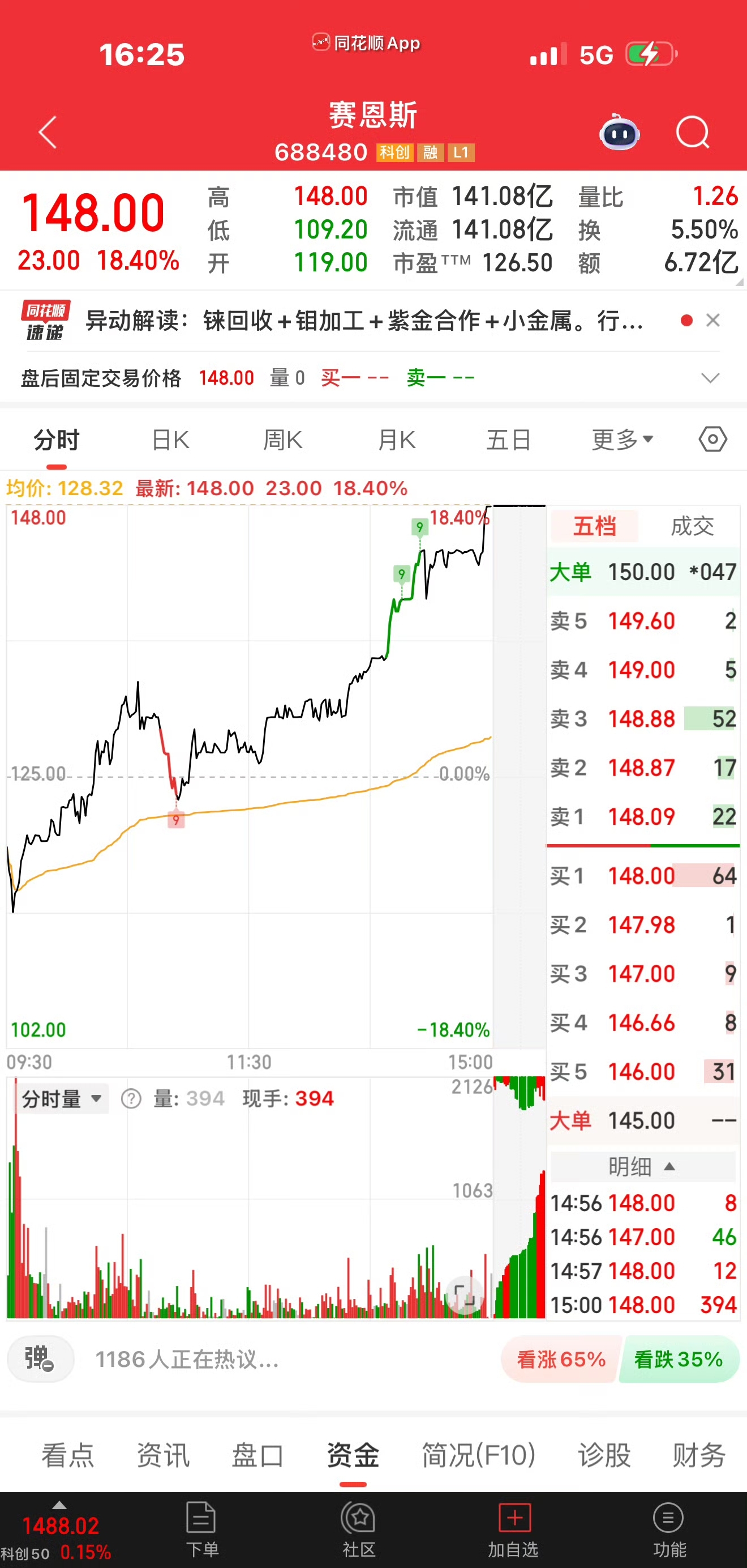 早盘一度快速下跌近8个点,然后快速回升,午后2点庄家快速拉升,收盘最高价大涨18%!近7个交易日里 股价从78元上涨到148元,接近翻倍!