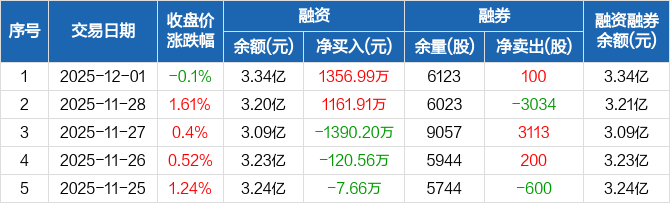 南芯科技:融资净买入1356.99万元,融资余额3.34亿元(12-01)