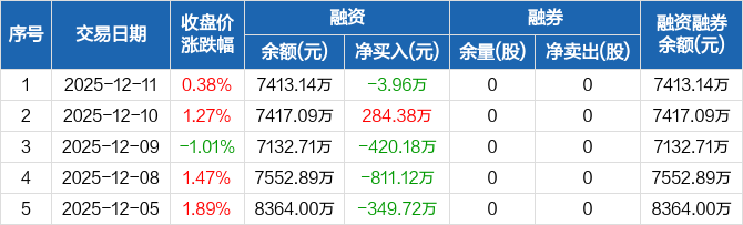 九州一轨:融资净偿还3.96万元,融资余额7413.14万元(12-11)