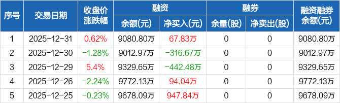 九州一轨:融资净买入67.83万元,融资余额9080.8万元(12-31)
