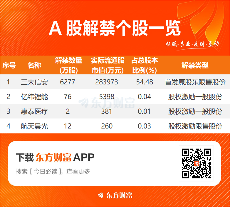【明日解禁】明日4股解禁 三未信安、亿纬锂能解禁市值居前
