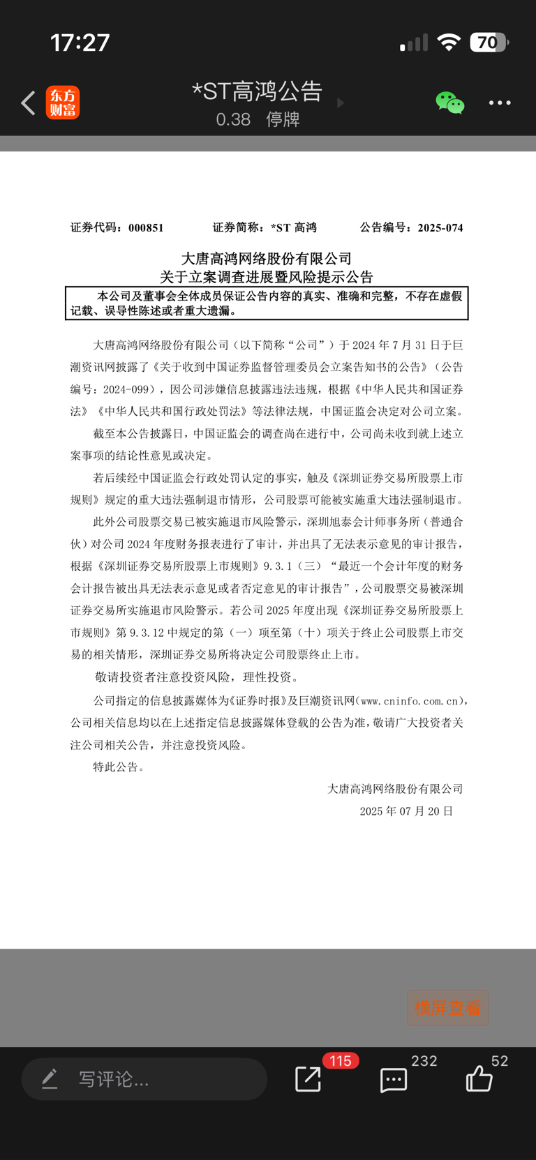$清越科技(SH688496)$ 只要立案公告或者后续提示公告里出现“若触及重大违法”之类字眼。基本就是退市石锤。。。。
