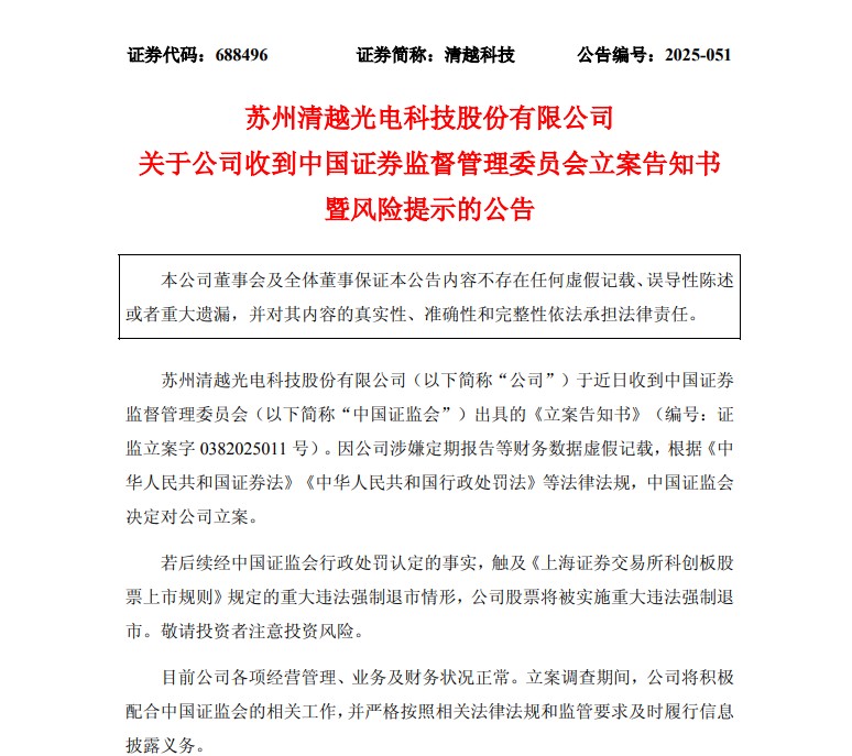 清越科技财务造假遭立案!【受损股民维权通道开启】符合条件者速查索赔资格:2025