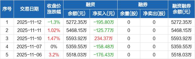 清越科技:融资净偿还195.8万元,融资余额5272.35万元(11-12)