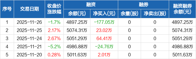 清越科技:融资净偿还177.05万元,融资余额4897.25万元(11-26)