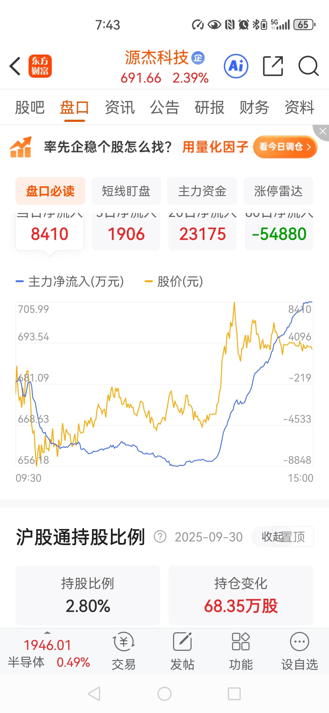 今天下午1点40分开始,主力资金从净流出到净流入从这一刻开始,主力资金沿70度角徐徐向上,疯狂扫货,直至收盘。该股牛势从今年5月、8月、10月签订2.5亿大单来,创新高,突破均线,走势独立,年底有签大单什么时间发布,业绩各大机构预测都超出预期,小摩儿今天抢了第二位置,一来一往,后面好戏不断上演,流通盘六千多万,盘子小好操作,后续精彩上演年度大戏!