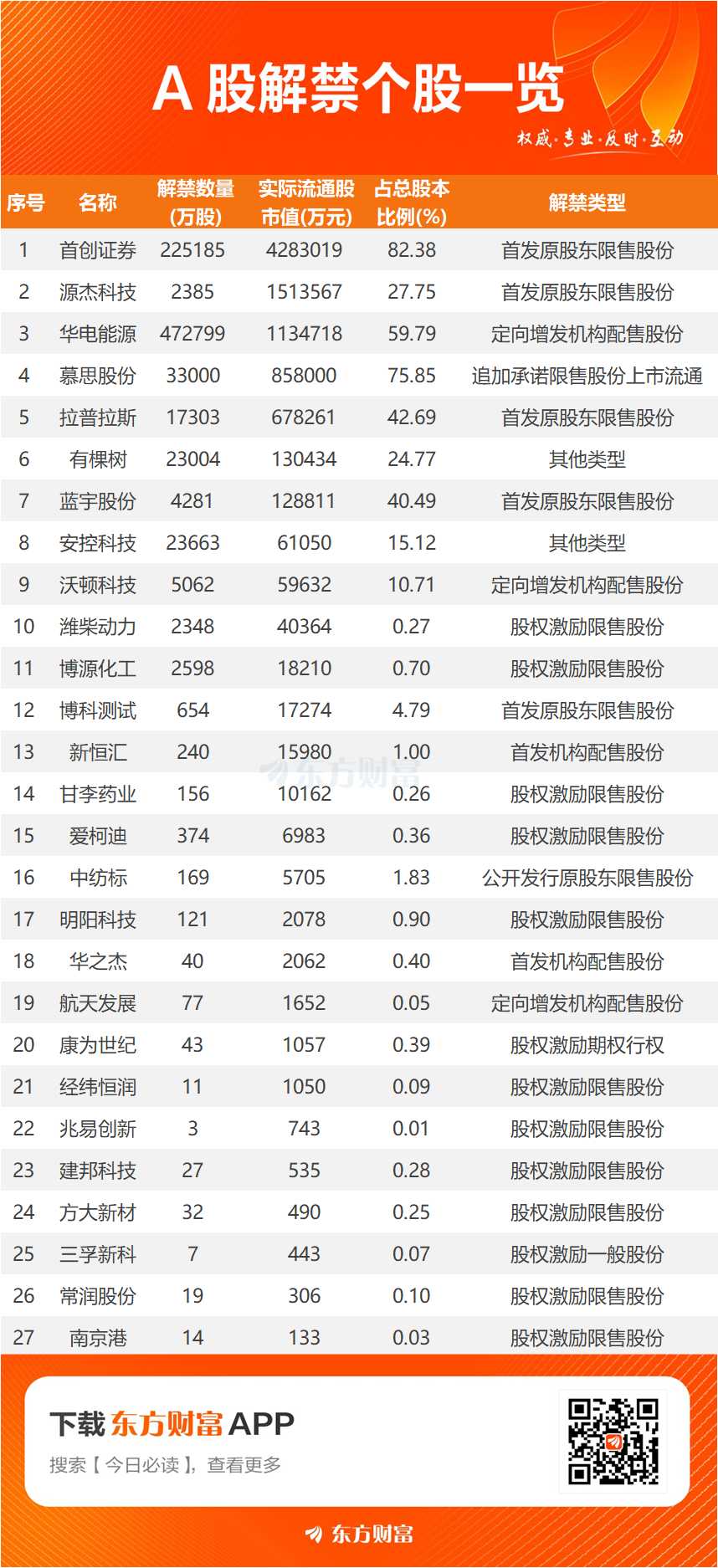 下周一27股解禁 首创证券、源杰科技解禁市值居前