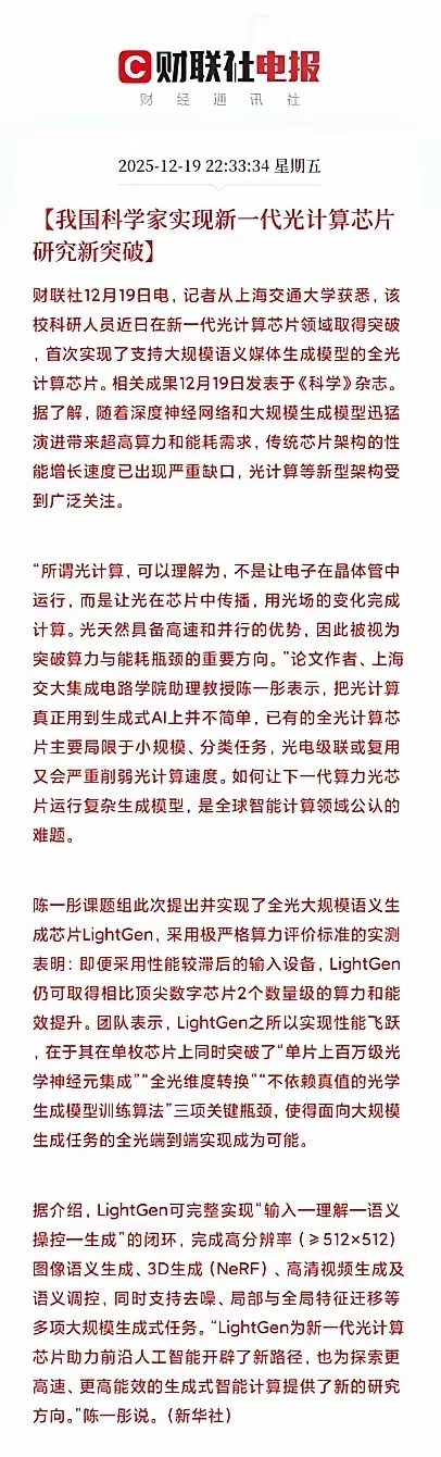 上海交大研发的新一代光计算芯片LightGen带来的技术突破,利好光芯片材料、制造设备、芯片设计封测、光模块应用全产业链,相关A股概念股及核心受益逻辑如下: