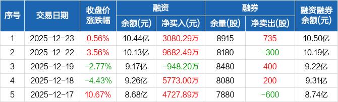 源杰科技:融资净买入3080.29万元,融资余额10.44亿元(12-23)