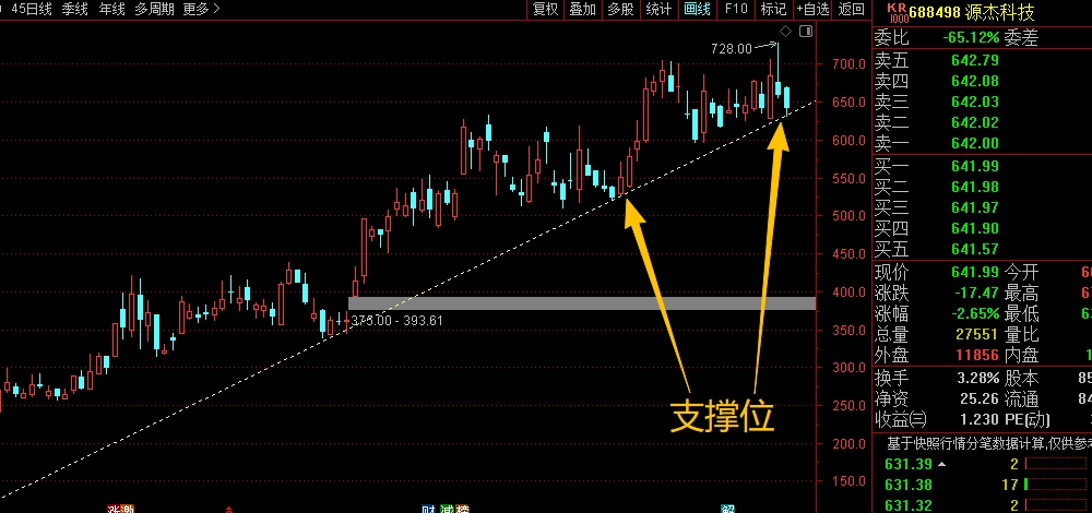 $源杰科技(SH688498)$ 中期趋势走得非常强,一直是45度角震荡上行的格局,短线来看主要是看脚底趋势线的支撑得失,能稳住就没问题,继续持仓上行,但有效跌破就要注意短线的回落风险,成本不低的可以考虑控制仓位应对,成本低的可以多观察,问题不大。#炒股日记# #周度策略#