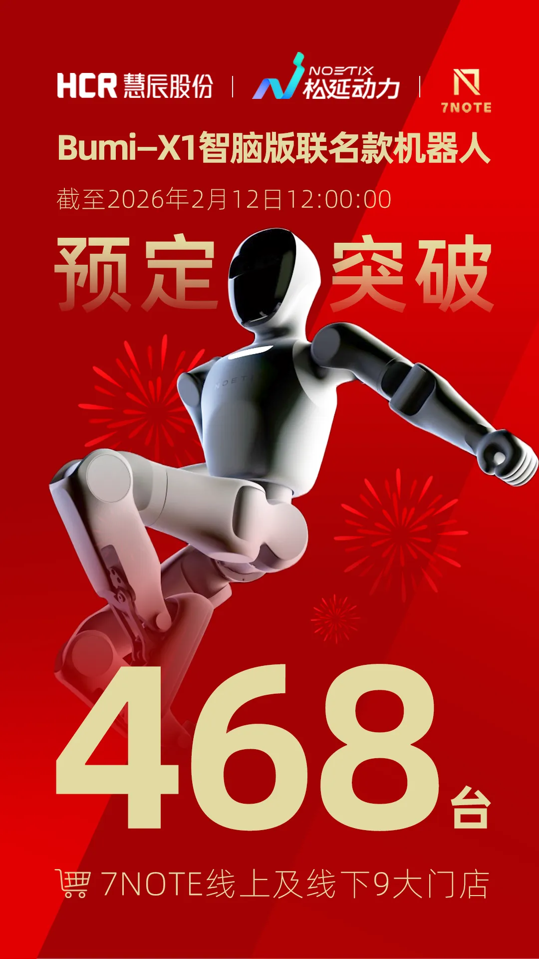 2026年2月11日,7NOTE机器人星空场联合松延动力、慧辰股份打造的春晚同款Bumi-X1人形机器人正式开启全渠道预售。开售仅一日,截至12日12时,产品预售订单量强势突破468台,以现象级热销态势迎来新春预售开门红,充分印证市场与消费者对这款春晚科技新品的高度认可。