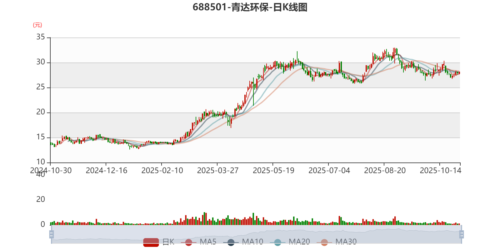 中证智能财讯青达环保(688501)10月30日披露2025年第三季度报告。前三季度公司实现营业总收入14.7亿元,同比增长91.13%;归母净利润1.24亿元,同比增长267.14%;扣非净利润1.2亿元,同比增长309.23%;经营活动产生的现金流量净额为-1678.26万元,上年同期为-2.41亿元;报告期内,青达环保基本每股收益为1.01元,加权平均净资产收益率为12.20%。