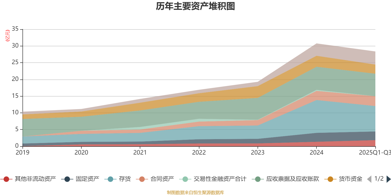 资产重大变化方面,截至2025年三季度末,公司存货较上年末减少22.61%,占公司总资产比重下降5.12个百分点;其他非流动资产较上年末增加36.55%,占公司总资产比重上升2.08个百分点;合同资产较上年末增加7.47%,占公司总资产比重上升1.48个百分点;在建工程合计较上年末增加78.33%,占公司总资产比重上升1.31个百分点。
