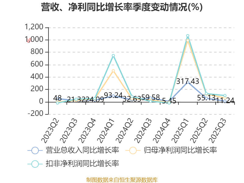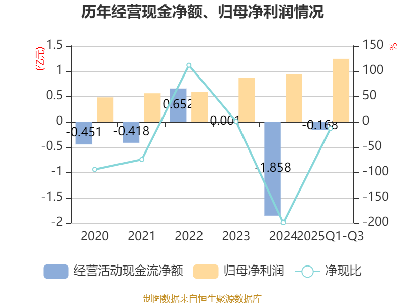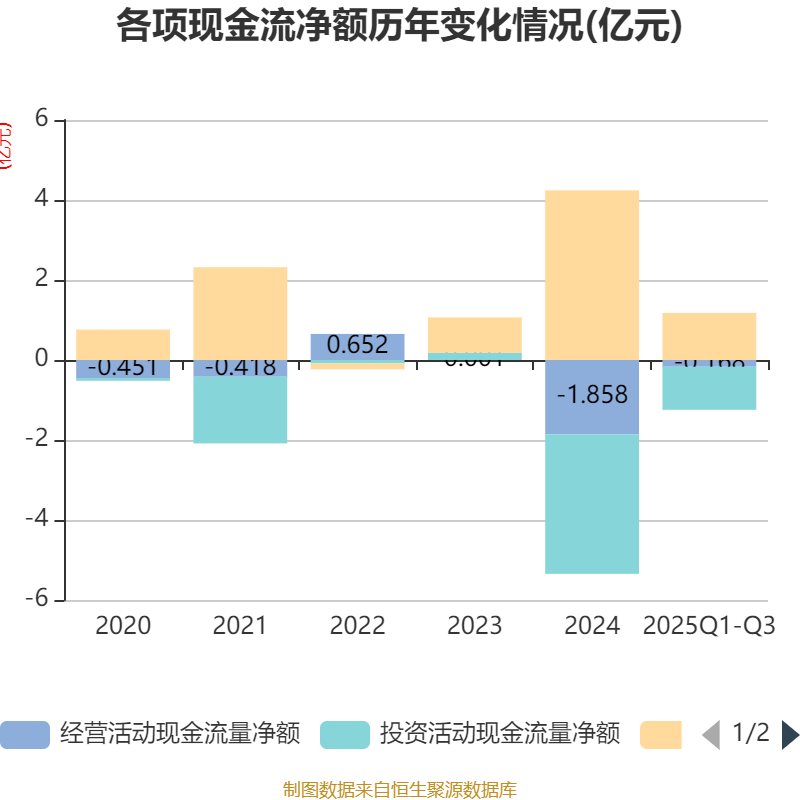 2025年前三季度,公司经营活动现金流净额为-1678.26万元,同比增加2.24亿元;筹资活动现金流净额1.18亿元,同比减少3亿元;投资活动现金流净额-1.08亿元,上年同期为-3.37亿元。