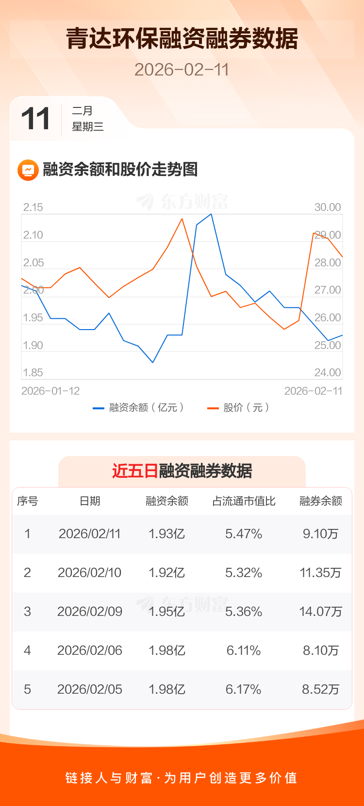 交易所最新数据显示,青达环保于2026年2月11日获融资买入655.70万元,融资偿还581.67万元,当日融资净买入74.03万元。目前,该股融资余额1.93亿,占流通市值比例为5.47%。