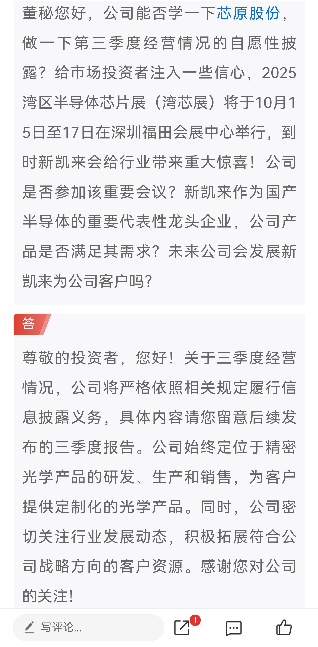 $茂莱光学(SH688502)$ 董秘的意思是公司与新凯来无关,不要痴心妄想了,看9.30财报吧。