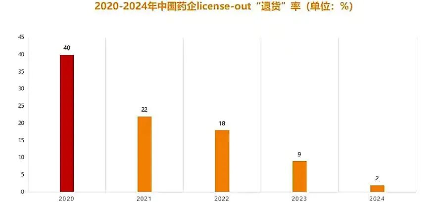 2020-2024年中国药企licence-out“退货”率来源:动脉网