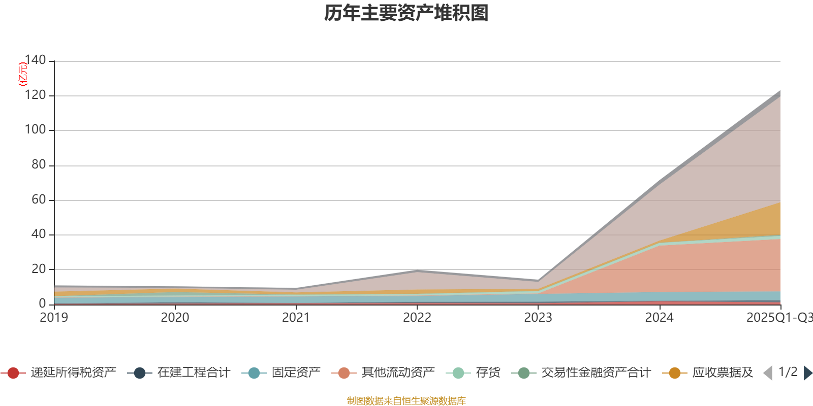 资产重大变化方面,截至2025年三季度末,公司应收票据及应收账款较上年末增加1474.65%,占公司总资产比重上升13.5个百分点;其他流动资产较上年末增加12.87%,占公司总资产比重下降12.95个百分点;货币资金较上年末增加88.99%,占公司总资产比重上升4.28个百分点;固定资产较上年末增加1.7%,占公司总资产比重下降2.87个百分点。