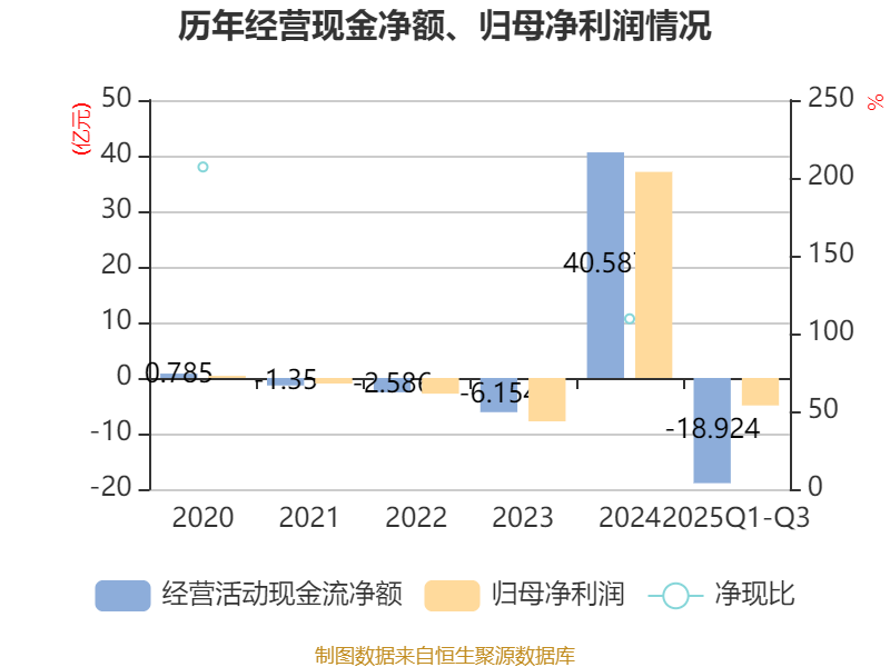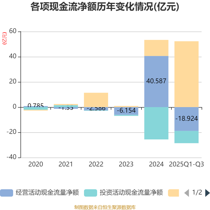 2025年前三季度,公司经营活动现金流净额为-18.92亿元,同比减少63.87亿元;筹资活动现金流净额52.26亿元,同比增加44.29亿元;投资活动现金流净额-9.7亿元,上年同期为-6.98亿元。