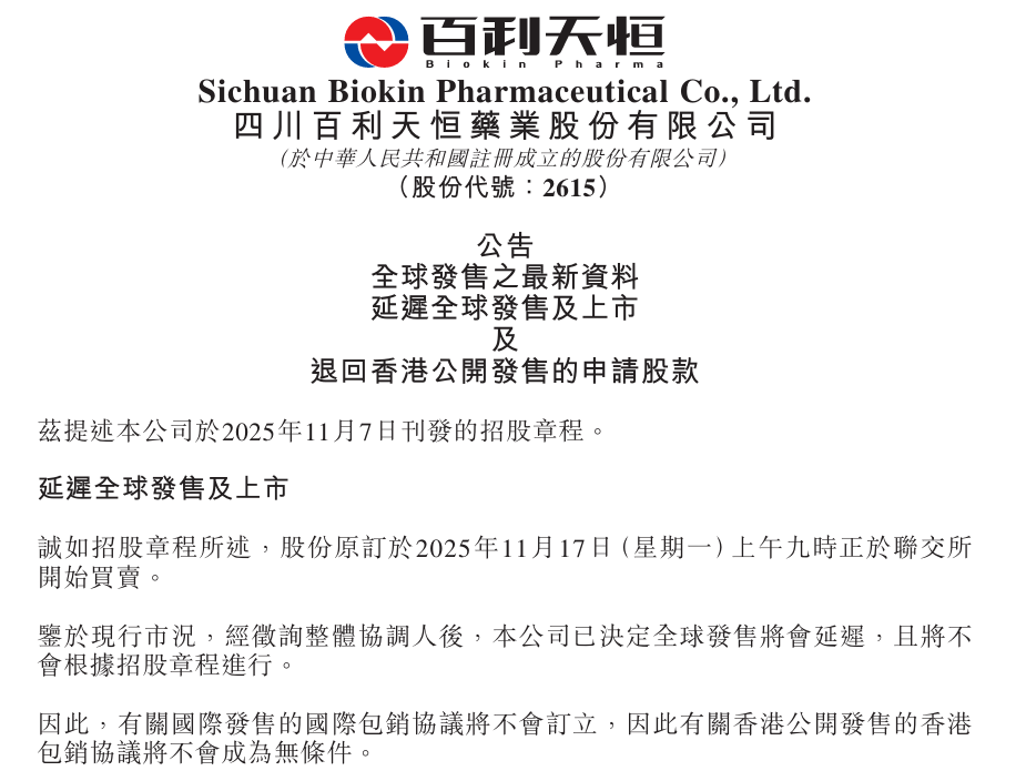 在H股香港公开发售的最后一日(11月12日),A股上市公司百利天恒(688506.SH)公告称,鉴于当前市场情况,公司决定延迟H股的全球发售及上市。据悉,本次H股香港公开发售于11月7日至12日期间开展,原计划股票于11月17日在香港联交所挂牌交易。随着上市计划推迟,百利天恒已同步提示投资者可通过网上白表服务申请退款,相关款项将于11月17日退还。