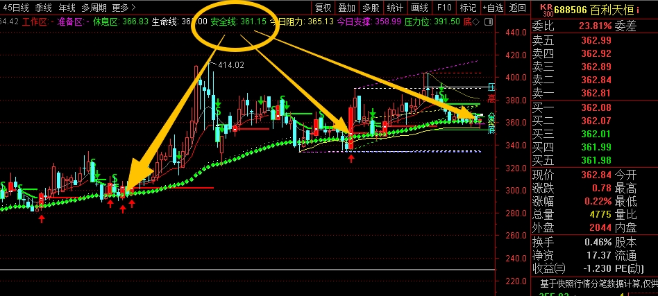 $百利天恒(SH688506)$ 中期趋势走得比较稳健,一直震荡向上的运行,近期小幅回落下来,主要是看安全线361.15位置的得失,前期每一次回落到这里都得到支撑,所以接下来这里就要重点盯着安全线的得失,能稳住问题不大,但有效跌破就要注意破位风险了,需要控制仓位应对。