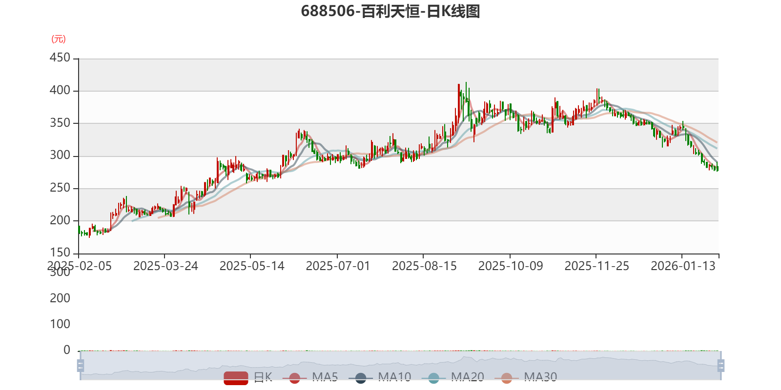 中证智能财讯百利天恒(688506)1月30日晚间披露2025年度业绩预告,预计2025年实现营业收入25亿元,同比下降57.06%;归母净利润亏损11亿元,上年同期盈利37.08亿元;扣非净利润亏损12亿元,上年同期盈利36.36亿元。以1月30日收盘价计算,百利天恒目前市盈率(TTM)约为-104.25倍,市净率(LF)约15.99倍,市销率(TTM)约45.87倍。