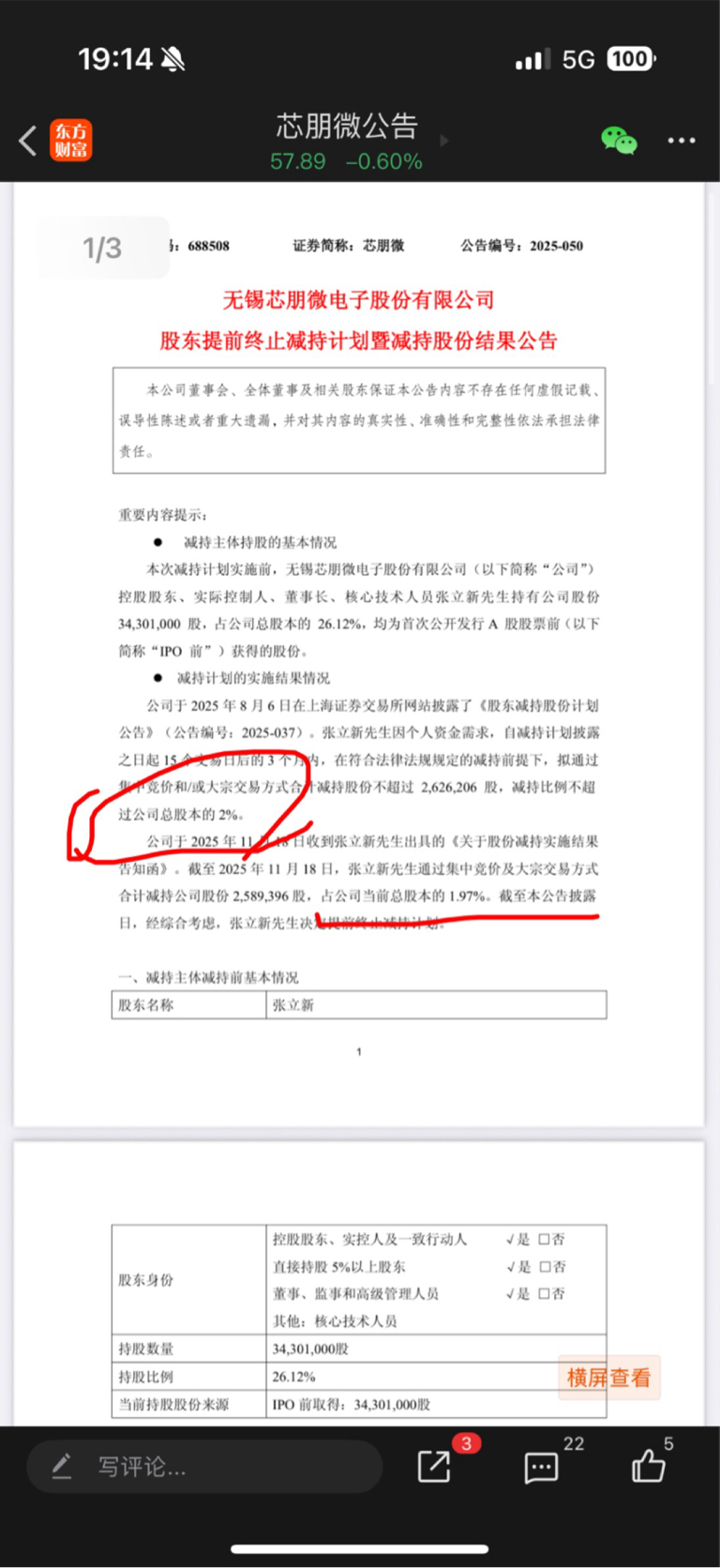 $芯朋微(SH688508)$ 张总太善良了,留着0.03%的股票不减提前终止了。被套的散户发帖感恩戴德