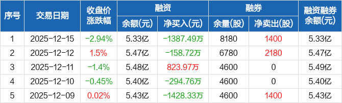 芯朋微:融资净偿还1387.49万元,融资余额5.33亿元(12-15)
