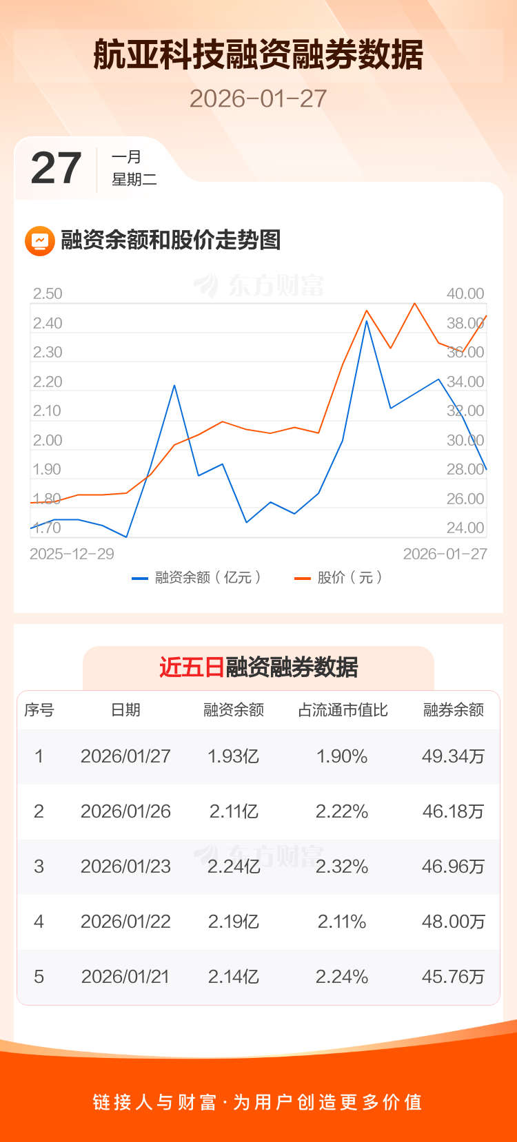 交易所最新数据显示,航亚科技于2026年1月27日获融资买入3401.81万元,融资偿还5212.05万元,当日融资净偿还1810.24万元。目前,该股融资余额1.93亿,占流通市值比例为1.90%。