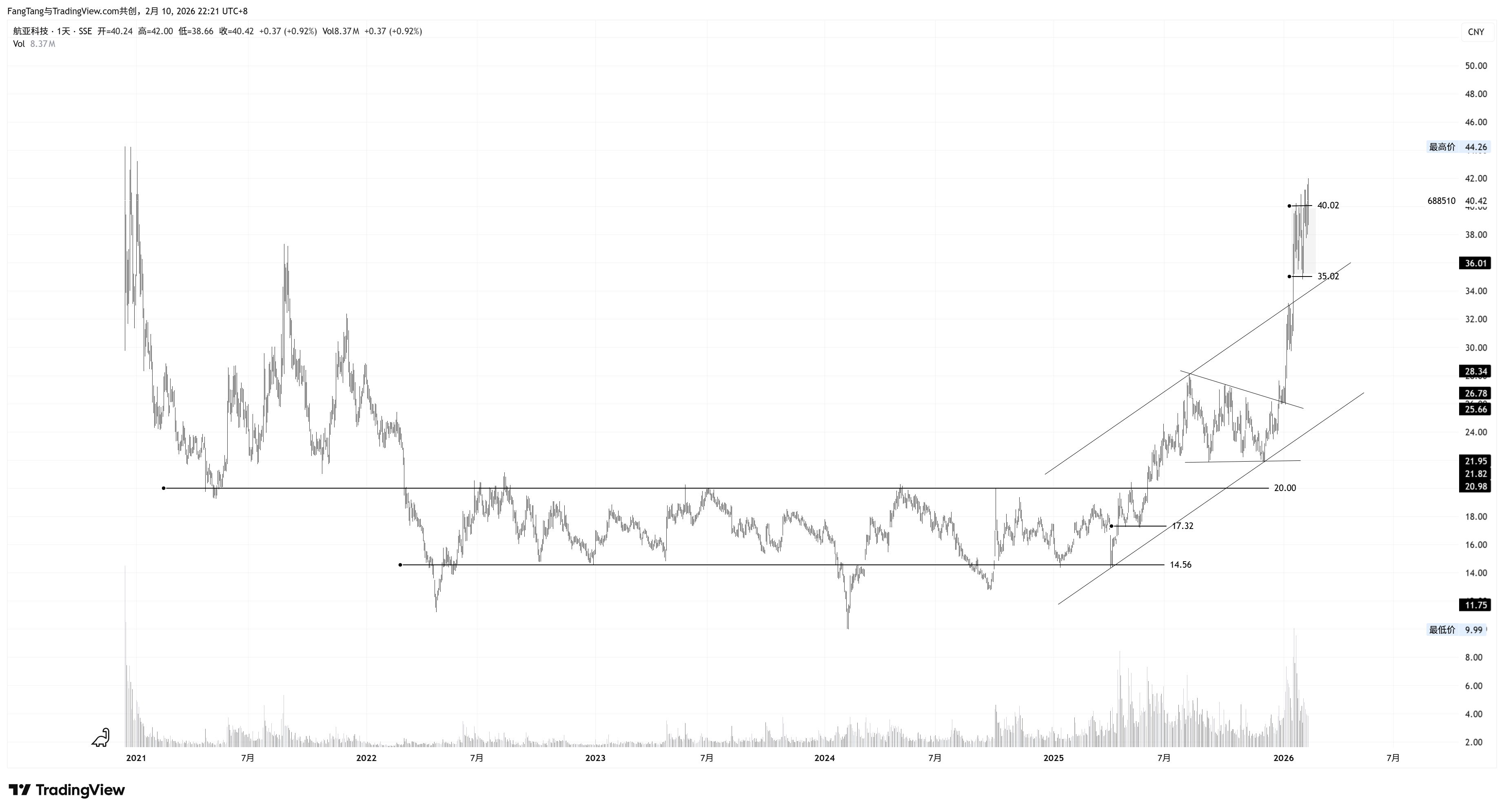 航亚科技,这个玩意也是自己的老长线了。目前持续在40附近震荡,最近几根线感觉有点儿要突破的意思。乐观~