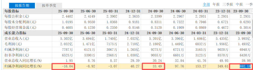 业绩方面,2025年前三季度,公司实现净利润0.78亿元,同比下降16.04%,增速较2024年同期的33.49%显著放缓,也远低于2023年同期692.18%的同比增速。