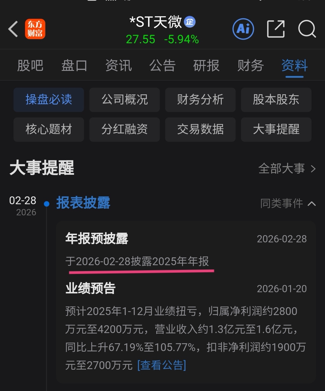 周末年报铁定摘帽,我是ST专业户,4年31倍利润几乎全靠ST,研究透彻我才敢下手,整个ST最早年报,历来最早年报2月都是铁定摘帽!没有一个不摘帽的例子,科创板摘帽最小市值,军工,商业航天,锂电池热门概念集于一身,机会难得,粉丝们别说我没提醒!