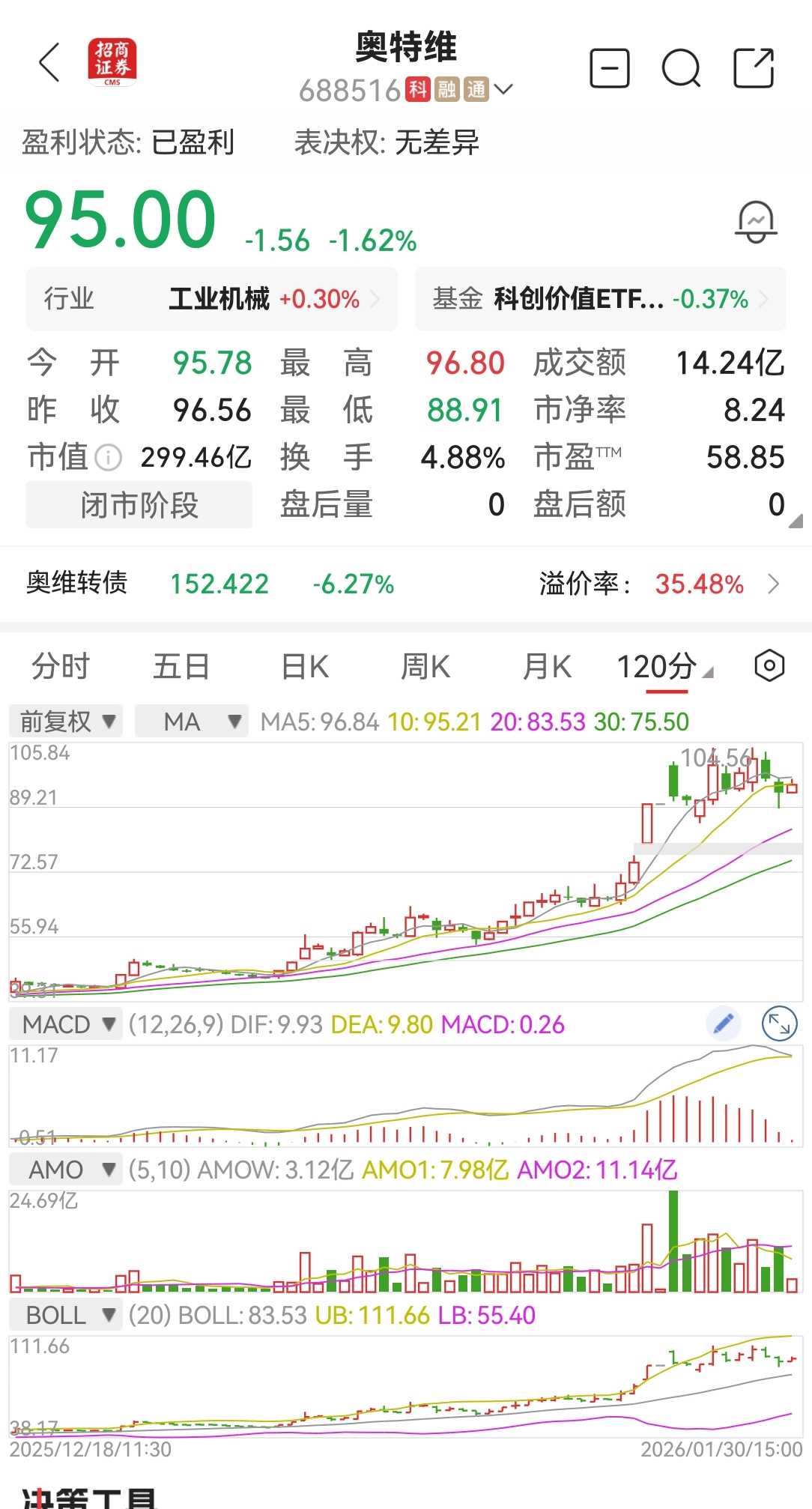 $奥特维(SH688516)$ 奥特维120分钟日线死叉了,周一不知道会不会反转