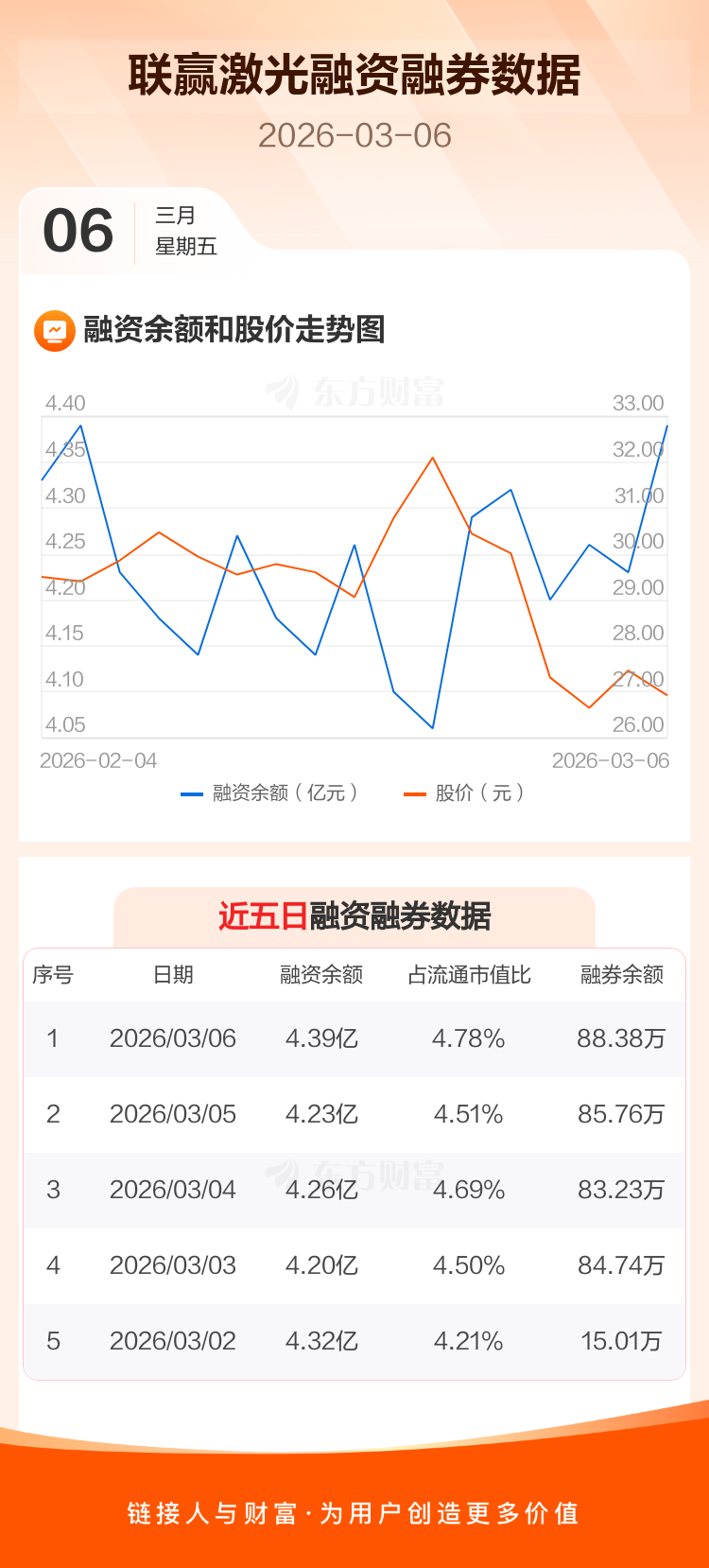 交易所最新数据显示,联赢激光于2026年3月6日获融资买入4231.35万元,融资偿还2643.46万元,当日融资净买入1587.89万元。目前,该股融资余额4.39亿,占流通市值比例为4.78%。
