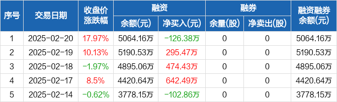 南亚新材:融资净偿还126.38万元,融资余额5064.16万元(02-20)