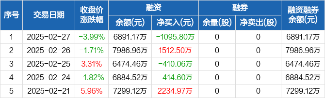 南亚新材:融资净偿还1095.8万元,融资余额6891.17万元(02-27)