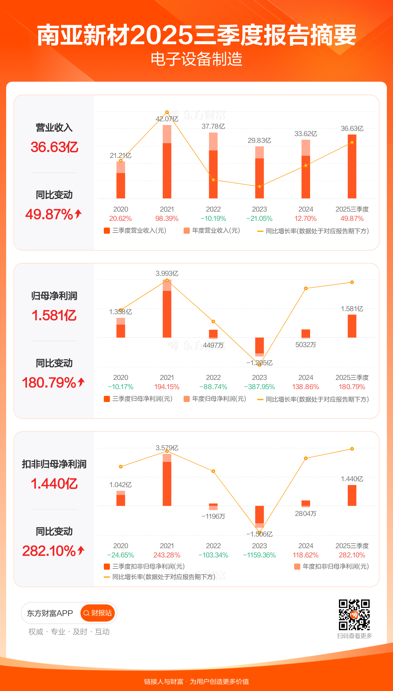 南亚新材10月30日发布2025年三季报显示,公司前三季实现营业收入36.63亿元,同比增长49.87%;归母净利润1.58亿元,同比增长180.79%;扣非归母净利润1.44亿元,同比增长282.10%。
